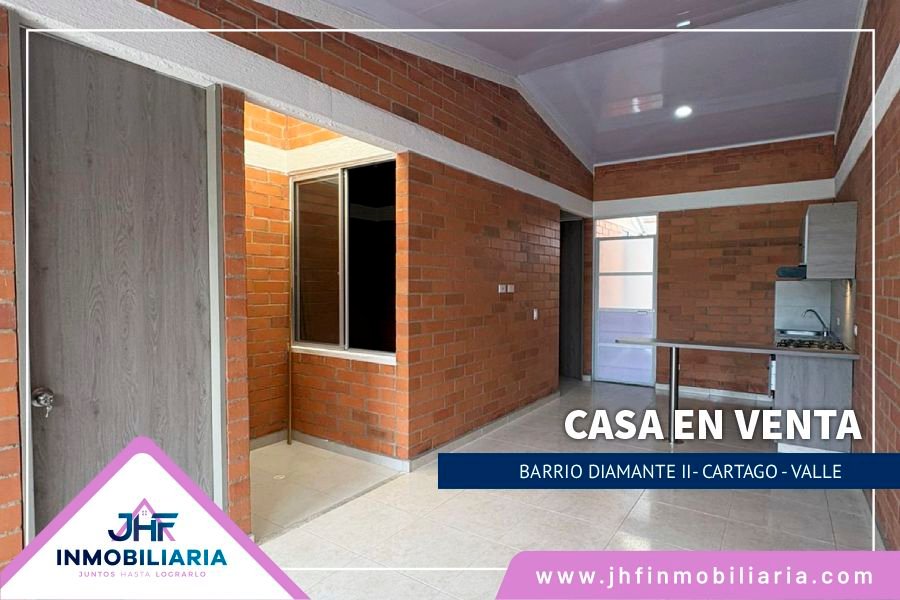 Casa en venta, ubicada en la ciudad de Cartago, Valle, en barrio el Diamante II. Consta de: 3 habitaciones, 3 closets, 1 baño, sala -comedor, cocina integral, pisos en cerámica, patio interno y externo y techo en PVC.