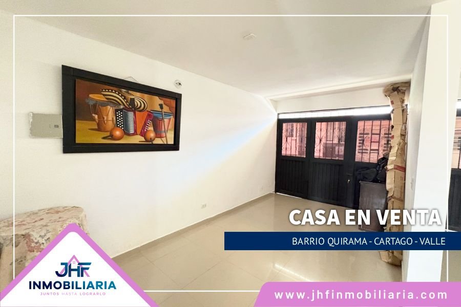 Casa en venta ubicada en la ciudad de Cartago, Valle; en el sector de Quirama. Cuenta con 3 habitaciones con closet, 2 baños sociales, 1 baño privado, sala comedor, garaje , patio en tierra para futura ampliación, cocina enchapada, casa unifamiliar.