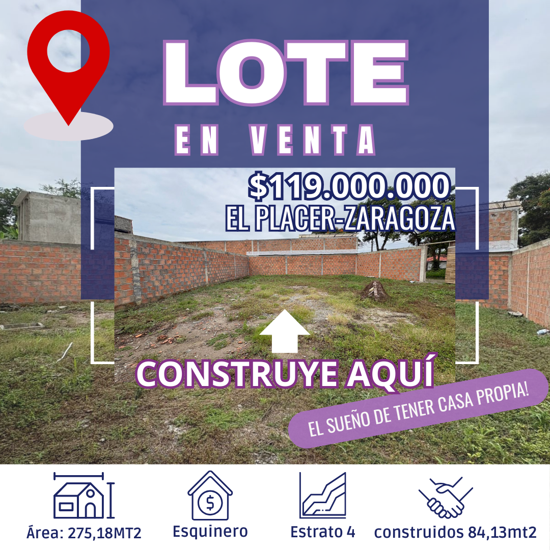 Lote en venta, ubicado en Zaragoza, en el barrio el placer. Esquinero, lote irregulares, puntos de agua, energía y alcantarillado. construidos 84,13mt2.